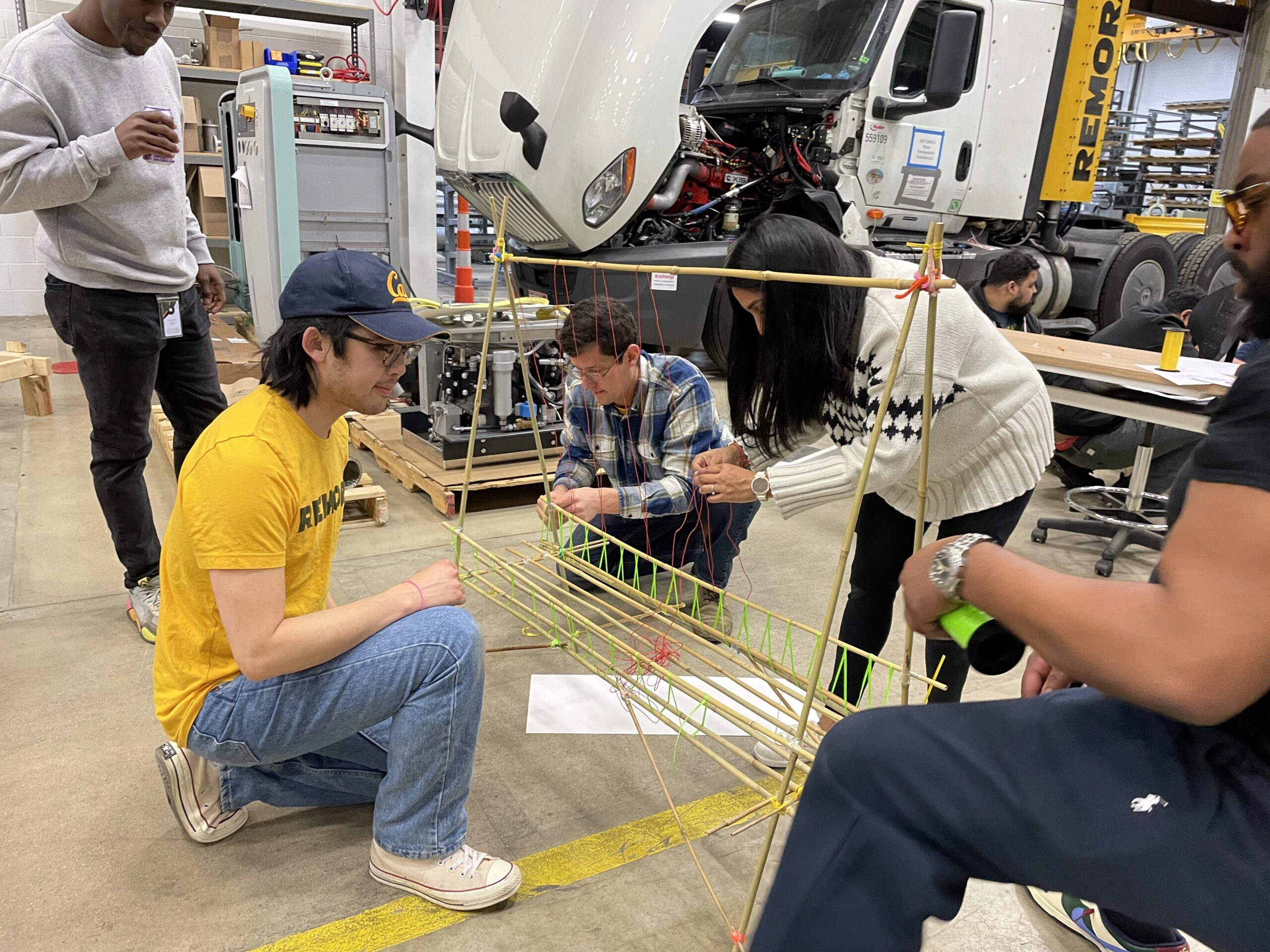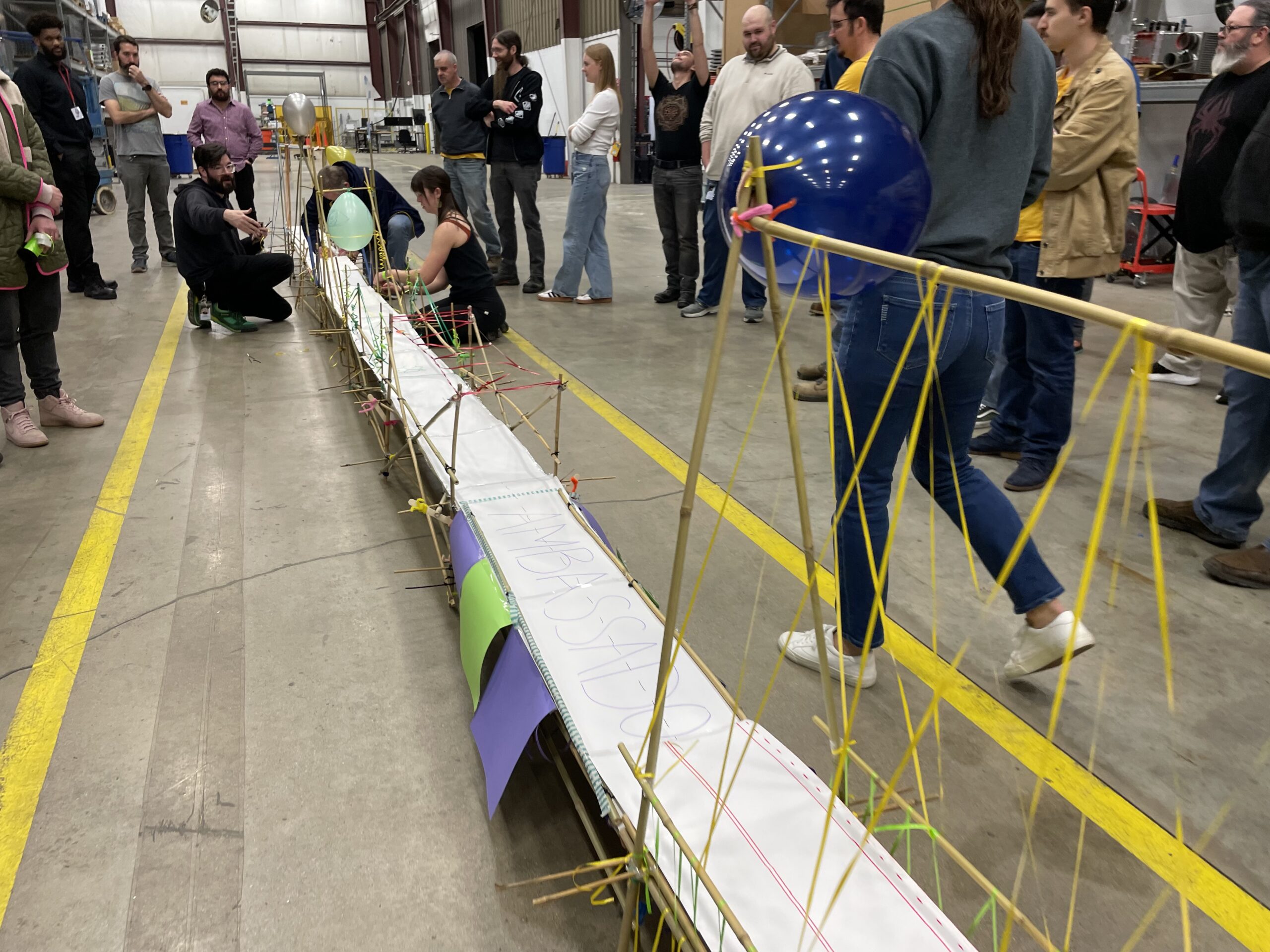 Teams link their segments and test the bridge using a remote control car, making necessary adjustments for a seamless ride.